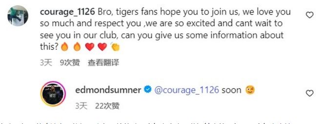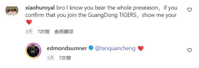 如今薩姆納在社媒與網(wǎng)友互動時(shí),他被網(wǎng)友問到希望他能夠加盟廣東男籃。薩姆納本人確認(rèn)表示“很快”。另一位網(wǎng)友表示如果確認(rèn)將加盟廣東男籃就貼出一個(gè)紅心表情,薩姆納也是回復(fù)一個(gè)紅心表情進(jìn)行確認(rèn)。
