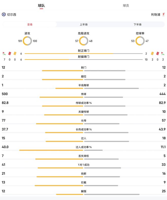 切爾西vs利物浦全場數(shù)據(jù):射門12-12,控球率53%-47%