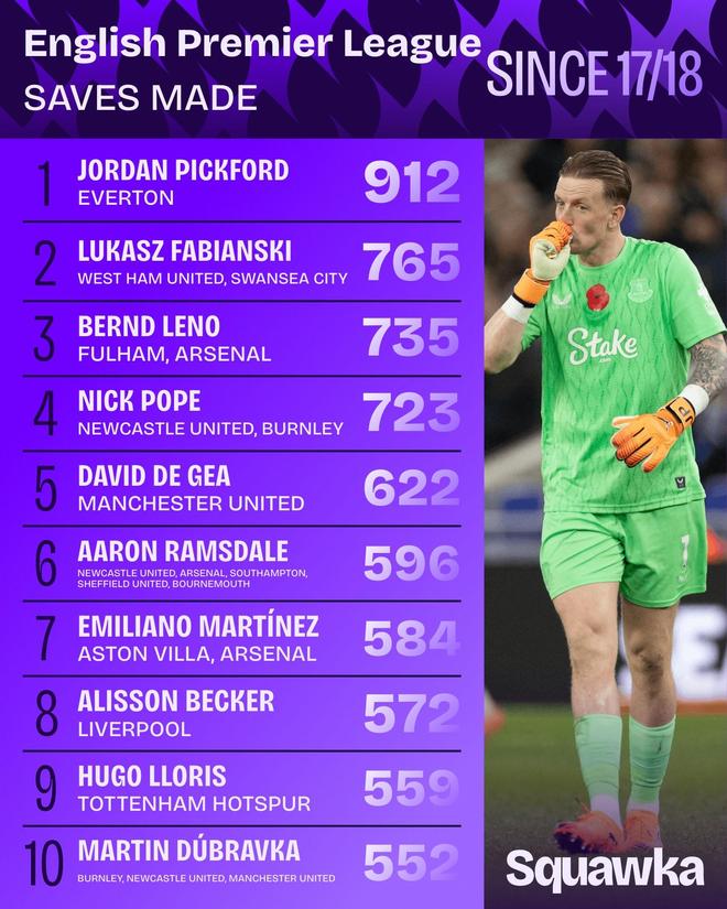 英超自17-18賽季以來門將撲救榜:皮克福德第1,德赫亞上榜